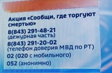 «Сообщи, где торгуют смертью», — с таким призывом обращаются сегодня полицейские к татарстанцам. В Республике стартовал первый этап всероссийской акции. Будут проходить профилактические мероприятия, просят также сообщать об известных фактах продажи наркотических веществ, телефоны на экране, акция продлится до 29 октября.