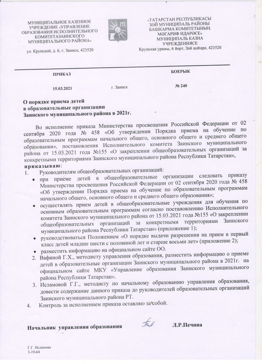 Приказ МКУ "Управление образования ИК ЗМР РТ" №195 от 01.03.2023 года "О порядке приема детей в образовательные организации Заинского муниципального района"