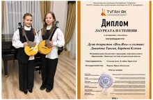 В номинации «Ансамбли», дуэт домристов «Инь-Янь» в составе Бардиной Ксении и Давыдовой Таисии стал Лауреатом 2 степени, преподаватель Селиверстова Зульфия Харисовна, концертмейстер Нырова Ирина Яковлевна. -