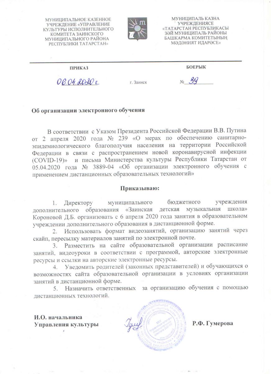 Приказ Об организации электронного обучения с применением дистанционных образовательных технологий