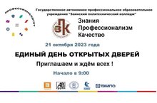 21 октября 2023 года ГАПОУ «Заинский политехнический колледж» откроет свои двери для обучающихся общеобразовательных организаций, родителей и педагогов в рамках ЕДИНОГО ДНЯ ОТКРЫТЫХ ДВЕРЕЙ, который пройдёт в 79 регионах России!!