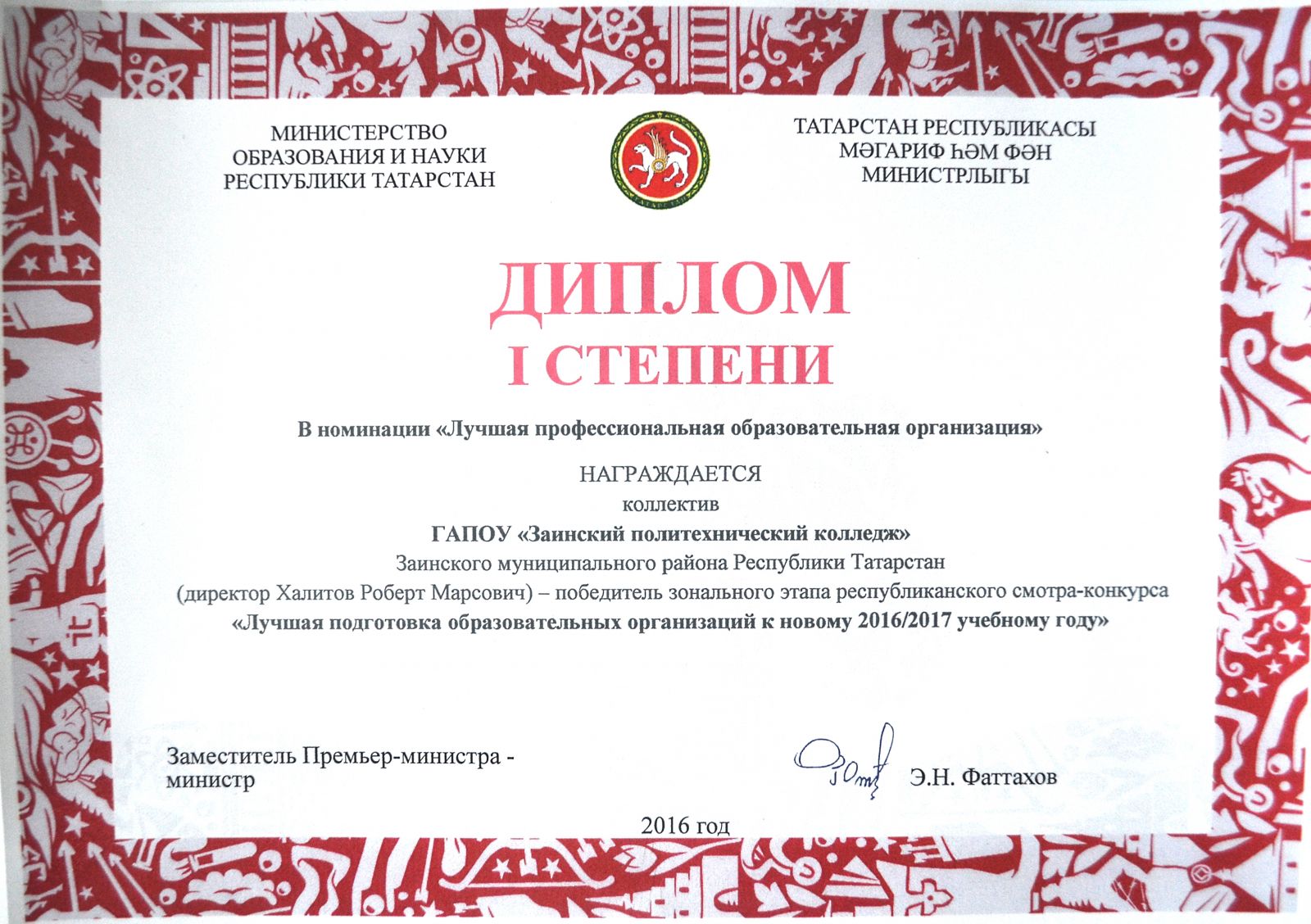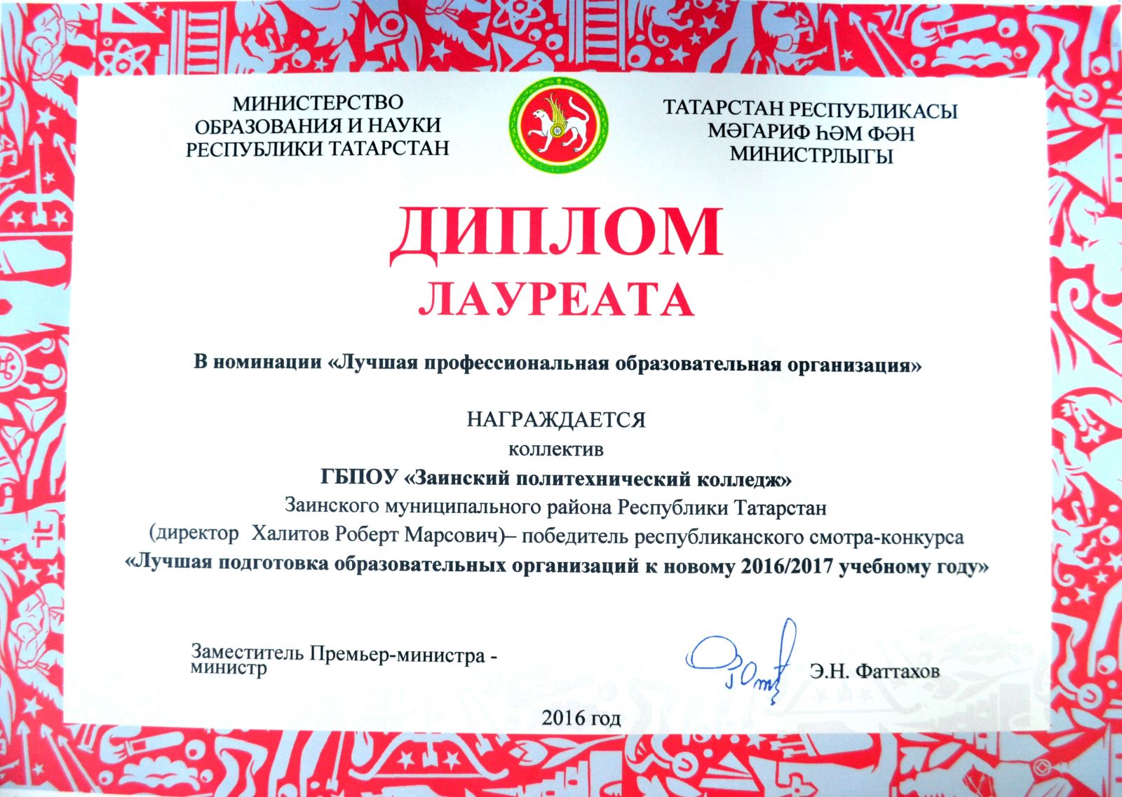 Опубликовано: 22.09.2016По итогам Республиканского конкурса на лучшую подготовку образовательных организаций к новому учебному году Заинский политехнический колледж занял Iместо в зональном этапе и удостоен Диплома лауреата в финальном этапе конкурса.