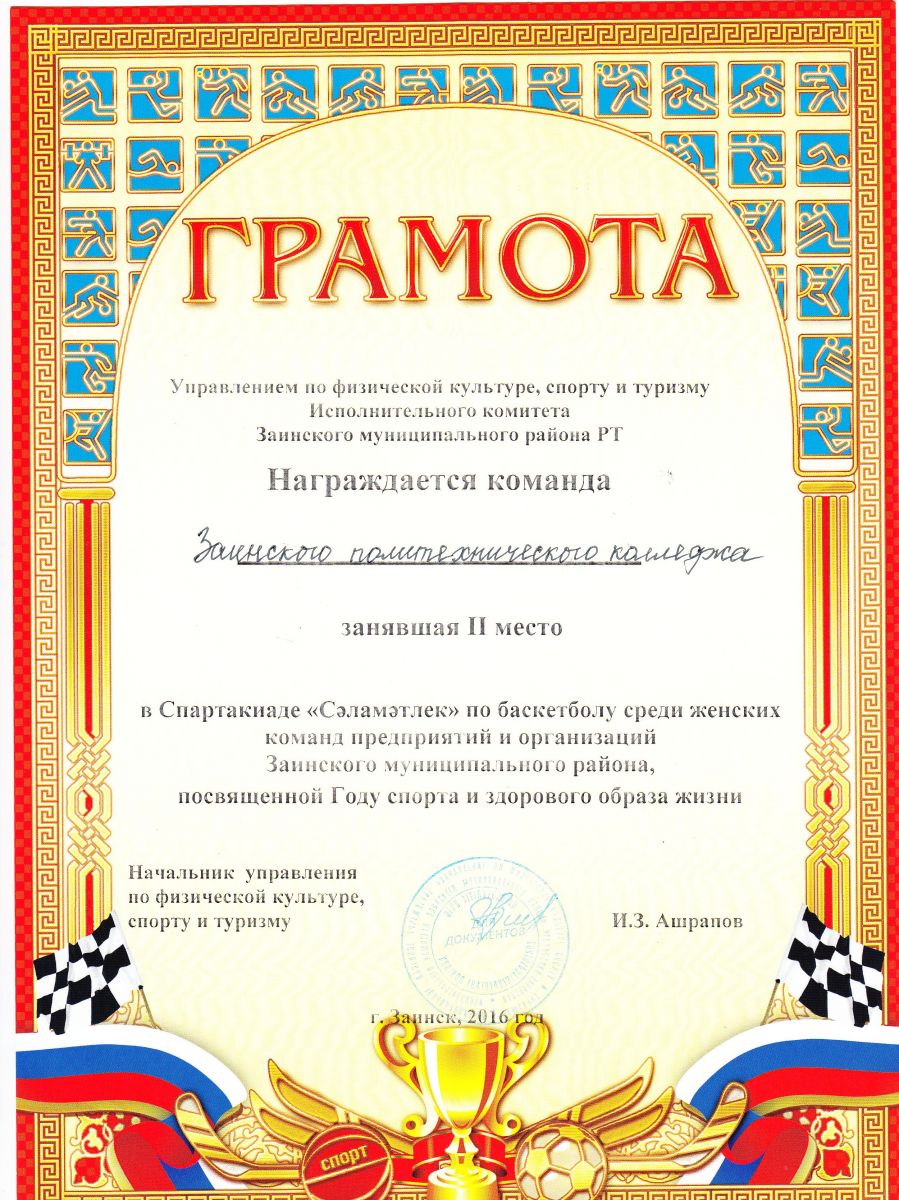 Опубликовано: 16.11.201616 ноября 2016 сборная команда ГАПОУ «Заинский политехнический колледж» в составе: Гильмановой Ф.Л., Тарасовой Е.А., Богомазовой С.И., Степановой Р.К., Миннехузиной Л.С., Ишмеевой Р.М., Хуснутдиновой Р.И., Ахметзяновой А.Ф., заняли 2 место по баскетболу среди женских команд предприятий и организаций, посвященной Году спорта и здорового образа жизни в рамках Спартакиады «Сәламәтлек».