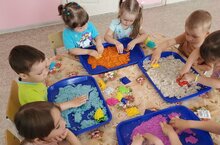 В последнее время мы часто говорим и слышим об инновационных технологиях в работе с дошкольниками. Одна из таких технологий – это песочная терапия. Песок – это универсальное средство для творчества и терапии, который оказывает развивающее действие на детей. Кинетический песок - это песок, являющийся чем-то средним между пластилином и песком из песочницы. Из него можно лепить различные фигуры, либо вырезать их при помощи формочек, а затем он одним движением руки превратится обратно в рассыпчатую песчаную массу. Кинетический песок на 98% состоит из натурального песка, а на 2% из полимера, но эти 2% имеют огромное значение. Синтетические полимеры делают материал пластичнее и приятнее. Песчинки не рассыпаются, а тянутся друг за другом. Простой контакт с кинетическим песком завораживает — детям и взрослым тоже нравится мять пластичный комок в ладони, перебираться пальцами. Материал необычный и манящий, почему его и называют волшебным, космическим. детском саду резервуары с умным песком рекомендуется использовать для занятий с детьми начиная с ясельного возраста. Контакт с пластичной массой обогащает сенсорное восприятие, расширяет кругозор и активизирует речевую деятельность.