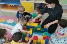 Дети ясельной группы Самоцветики строили домик для зверей из строительного материала, учитились путем прикладывания друг на друга строить постройки. Тем самым прявляли чувство заботы о зверях, чувство партнерства во воремя постройки домика.
