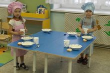 В средней группе «Жемчужинки» воспитанники дежурят по столовой. Они надевают фартуки и шапочки и помогают младшему воспитателю накрывать на стол: ставят вазочки с салфетками и раскладывают ложки. Море эмоций и впечатлений у ребят от этого процесса. -