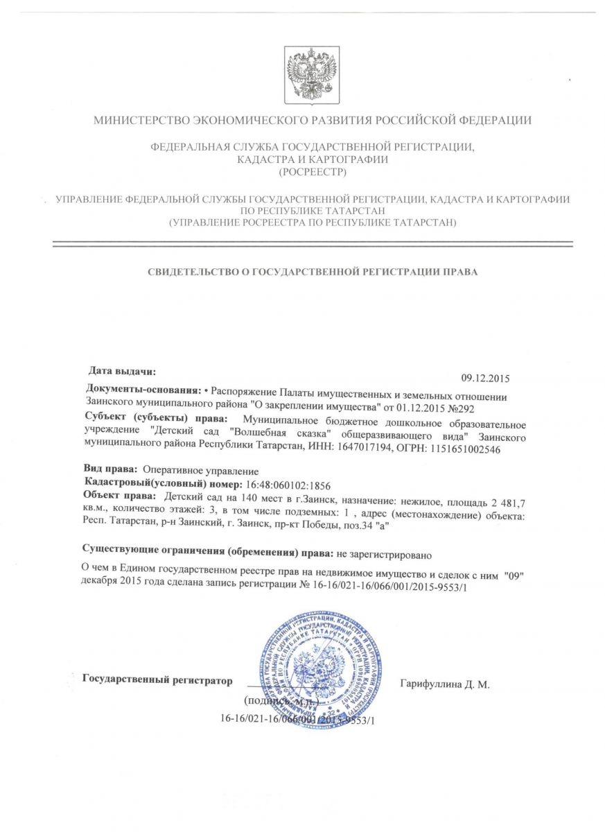 - Свидетельство о государственной регистрации на здание МБДОУ "Детский сад "Волшебная сказка"