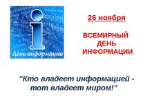 26 ноября 2018 года - Всемирный день информации. Отмечается ежегодно с 1994 года по инициативе Международной академии информатизации и Всемирного информациологического парламента. В этот день в 1992 году состоялся первый Международный форум информатизации. -
