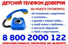 8-800-2000-122 – единый номер телефона доверия (служб экстренной психологической помощи) для детей, подростков и их родителей. Телефон доверия действует круглосуточно. Звонок анонимный и бесплатный с любого телефона!
