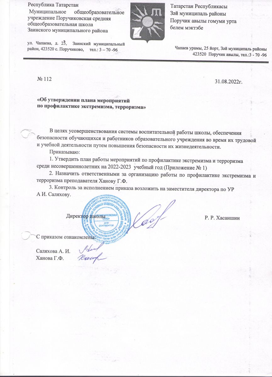 Приказ " Об утверждении плана по профилактике экстремизма в школе" на 2022-2023 учебный год