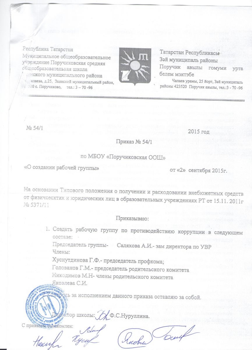 Приказ о создании рабочей группы по противодействию коррупции