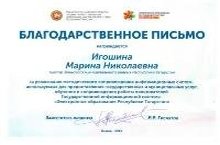 Министерство цифрового развития государственного управления информационных технологий и связи РТ награждает Игошину Марину Николаевну Благодарственным письмом. Пять лет Марина Николаевна является консультантом- аналитиком Государственной информационной системы «Электронное образование РТ» в Заинском муниципальном районе. Методическое сопровождение информационной образовательной среды электронных журналов и дневников, сайтов выливаются в качественную работу тьюторов и учителей образовательных учреждений. Мы ее коллеги поздравляем Игошину Марину Николаевну с высокой оценкой её труда.