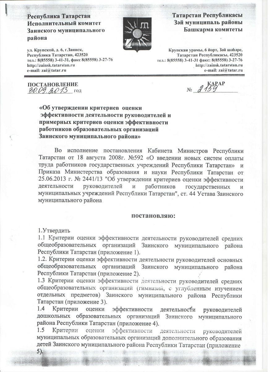 Постановление руководителя Исполнительного комитета «Об утверждении критериев оценки эффективности деятельности руководителей и примерных критериев оценки эффективности работников образовательных организаций Заинского муниципального района» №2159 от 30.09.2013
