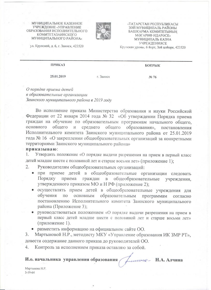 Административный регламент 2021 года предоставления муниципальной услуги " Прием заявлений о зачислении в образовательные организации, реализующие программы общего образования" в Заинском муниципальном районе Республики Татарстан (на рус. яз.) (на тат.яз) Постановление