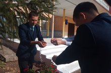 Акция"Капля жизни", в рамках этой акции ученики 9 класса набрали воду из чаши в ладони и полили цветы из руки- они символически поделились с водой с теми, кого уже нет.