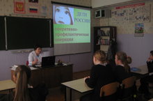 В соответствии с планом мероприятий межведомственной комплексной оперативно-профилактической операции «Дети России-2017» , сегодня в школе для учащихся 9 класса была проведена профилактическая беседа с участием медицинского работника Даниловой Г. С. , направленное на предупреждение распространения наркомании среди несовершеннолетних в общеобразовательных организациях. Учащиеся посмотрели презентацию по данной теме. В конце мероприятия Галина Селевестровна ответила на вопросы учеников.
