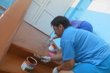 С 1 июля в нашей школе начался текущий ремонт здания. Ежедневно сотрудники технического персонала проводят покраску, моют окна и т.д.