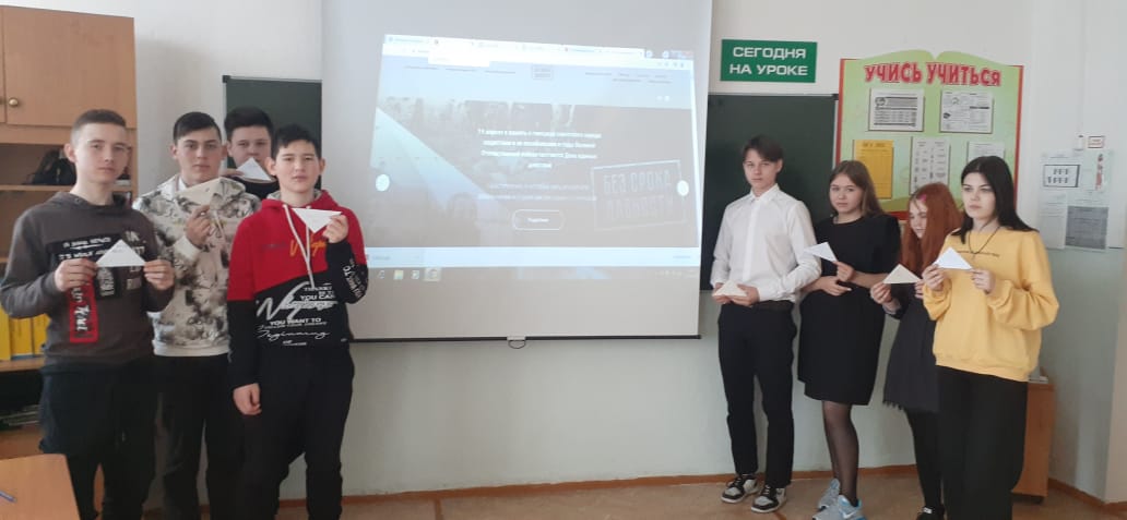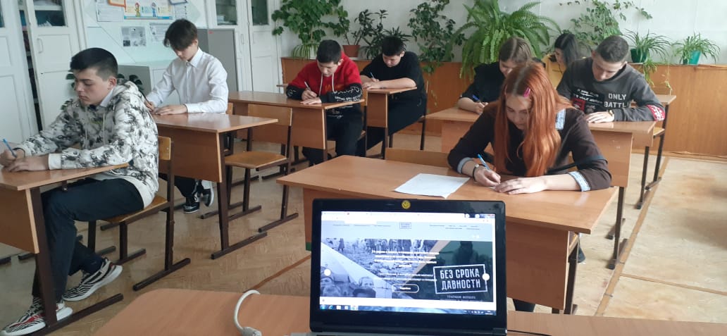 В 7-9 классах был показан видеофильм «Без срока давности». Просмотрена мультимедийная презентация с обсуждением об узниках, которые находились в концлагерях. Завершился классный час написанием письма в будущее «Нельзя забыть!». Это письмо-послание самому себе и своим потомкам в форме треугольника (военного) письма, в котором выражается личное восприятие и позиции обучающихся о преступлениях нацистов в отношении мирного советского населения.