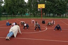 Каждое утро в пришкольном лагере труда и отдыха "Муравейник" начинается с утренней разминке на спортивной площадке.