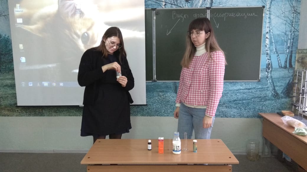 Адыля Камилевна раскрыла перед учащимися вторую тему «Фальсификация молока», в ходе которой был проведен практический опыт с привлечением учащихся на тему «Фальсификация молока (крахмалом, водой, содой)». Целью опыта было сформировать практические навыки учащихся при определении качественного и некачественного молока. Было использовано магазинное молоко, рН-полоски для определения среды.