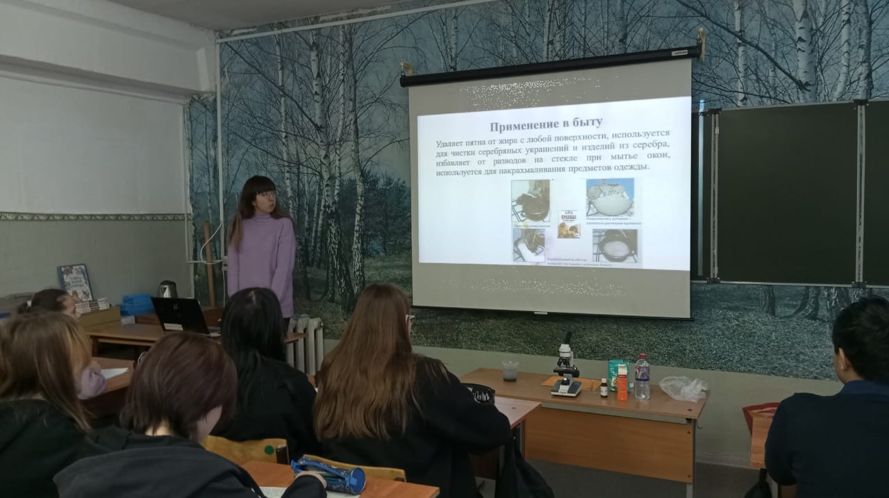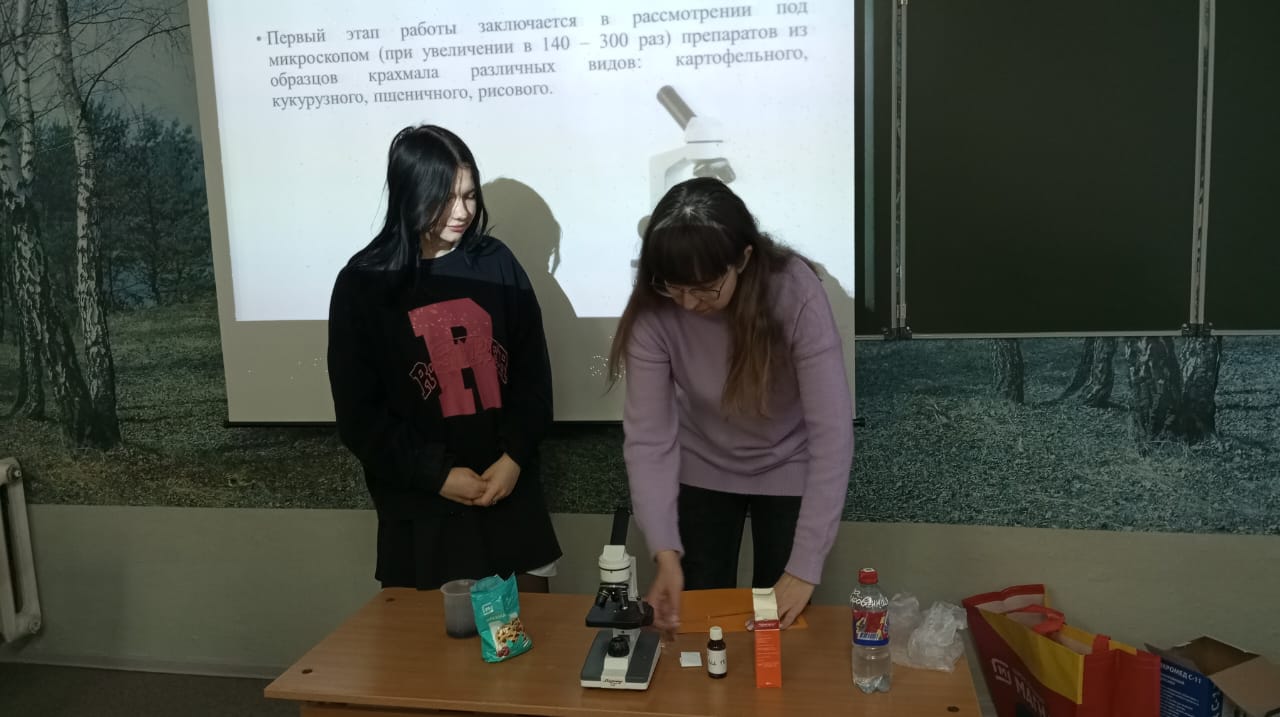 22 декабря занятие с учащимися аграрного 8 класса в очном формате урок-практикум провели представители двух вузов: Карина Юрьевна Николаева, аспирант кафедры биологической химии, физики и математики КГАВМ, Сибгатуллова Аделя Камилевна, кандидат ветеринарных наук, доцент кафедры биотехнологии, животноводства и химии ФГБОУ ВО Казанского ГАУ. Кариной Юрьевной была представлена тема «Опасности, связанные с дисбалансом питательных веществ в рационе». В начале занятия бала создана интересная проблемная ситуация. Преподаватель осветил такие вопросы, как состав питательных веществ в различных продуктах, особо обратив внимание на белки, жиры и углеводы. В доступной форме рассказал об этапах пищеварения в пищевом тракте, о различных заболеваниях и нарушениях в организме человека при недостатке витаминов, макро- и микроэлементов, используя в ходе своей лекции интересную красочную презентацию. Подробно остановилась на характеристике трех важных веществ в питании (белков, жиров и углеводов): в каких продуктах они содержатся, их важность для организма, к чему может привести их недостаток и избыток. В конце лекции был сделан вывод о том, что для нормального функционирования организма в рационе питания соотношение белков, жиров, углеводов должно быть следующим: 1:1,2:4. Аделя Камилевна интересно представила тему «Определение органолептических и физико - химических показателей картофельного крахмала», рассказала, что такое крахмал, где он синтезируется и в каких процентах, о видах крахмала и его физических свойствах, подробно остановилась на описании органолептических оценках качества крахмала, на определении фальсификации картофельного крахмала, также осветила тему о применении крахмала в быту и в кулинарии. В ходе практики дети определяли наличие вкуса и хруста в крахмале, рассматривали гранулы крахмала различных видов в микроскоп, научились определять органолептические показатели картофеля.