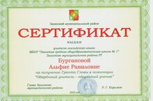 31 мая 2022 года состоялась церемония награждения победителей и призеров всероссийского и республиканского этапов олимпиад школьников. Бутакова Аделя, ученица 11 класса нашей школы, учитель Бурганова А.Р. стали обладателями гранта главы «Одаренный учитель-Одаренный ученик».