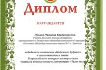 МБОУ "ЗООШ №1" поздравляет учителя русского языка и литературы Ильину Н.В. победителя заключительного этапа Всероссийского конкурса мастер - класса учителей родного языка и литературы "Туган тел" в номинации "Надежное будущее".