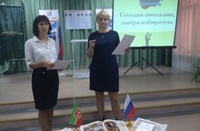 В рамках реализации муниципальной программы «Дни молодого избирателя в Республике Татарстан» в школе проходят классные часы «Сегодня школьник, завтра избиратель».9 сентября учителями истории и обществознания Колесовой В.В. и Красильниковой Е.Н.был проведен урок «Сегодня школьник, завтра избиратель» для учащихся 10-11 классов. На встрече присутствовали Биккинина Т.В. и Шагиев Л.М. депутаты Заинского городского Совета Заинского муниципального района Республики Татарстан. Учащиеся обсудили вопросы избирательного права, особенности предстоящих выборов. Старшеклассники высказали свое мнение по проблеме участия в голосовании и необходимости формирования четкой политической позиции в качестве будущих избирателей. Перед учащимися выступили гости, которым были заданы вопросы касающие6ся депутатской деятельности.