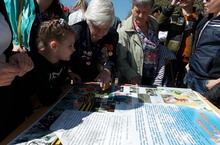 На бульваре Победы учащиеся школ презентовали альбомы с воспоминаниями ветеранов войны, их фотографиями, сочинениями о героях войны, рисунками. Выставка называлась «Память хранят живые». Наша школа презентовала книгу «Никто из нас забыть войны не может…». В создании книги приняли участие педагоги и учащиеся с 1 по 11 класс. Была собрана информация о 30 ветеранах (ветераны Великой Отечественной войны, труженики тыла, вдовы), которые проживают в микрорайоне школы. Работа над книгой будет продолжаться, чтобы увековечить в памяти людей как можно больше воспоминаний ветеранов.