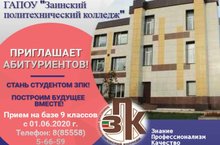 ГАПОУ «Заинский политехнический колледж» приглашает абитуриентов стать студентом ЗПК. Прием на базе 9 классов с 01.06.2002 г. С информацией о программе подготовки специалистов среднего звена и квалифицированных рабочих и служащих можно ознакомиться