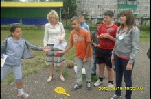 Городская легкоатлетическая эстафета по станциям. Наша школа подготовила две станции: первая - прыжки на мячах, вторая – сбивание кеглей мячом. Лагерь предоставил на конкурс две команды «Рваный кед» и «220 вольт» по десять человек в каждой команде. Каждая команда приготовила название, девиз, эмблемы. Обе команды выступили достойно.