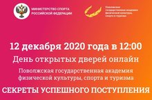 12 декабря 2020 года в 12.00 часов ФГБОУ ВО "Поволжская государственная академия физической культуры, спорта и туризма" проводит онлайн-мероприятие День открытых дверей. В программе: выступление руководства Академии, ответственного секретаря приемной комиссии, подробный инструктаж по поступлению. Также каждый зарегистрировавшийся на онлайн-мероприятие получит бесплатный доступ к электронной библиотечной системе и список литературы для подготовки к поступлению в Академию. Ссылка для регистрации https://www.sportacadem.ru/registraciya_na_den_otkrytyh_dverej/.