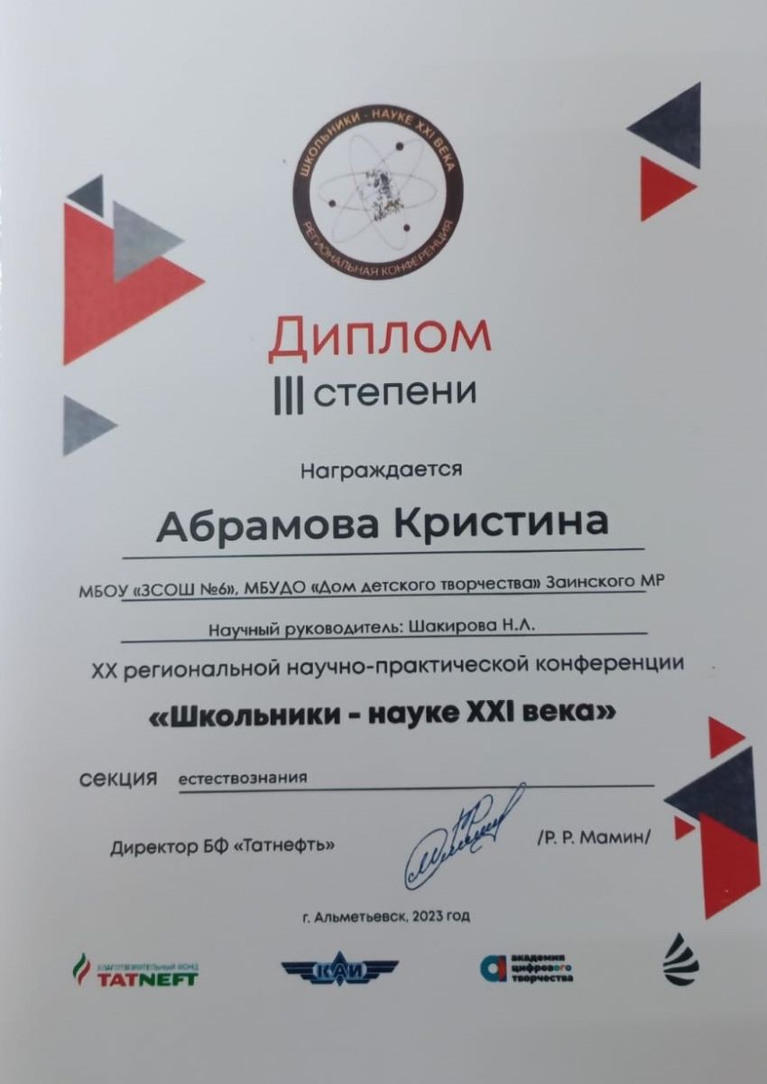 XIX региональная научно-практическая конференция «Школьники – науке XXI века», г.Альметьевск, 14.04.2023г. (фото 1) (фото 2) (фото 3)