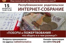 15 декабря в Казани пройдет второе республиканское родительское интернет-собрание, посвящённое вопросам противодействия проявлениям коррупции в системе образования. Начало в 12.00. Его проведет замминистра образования и науки РТ Гульнара Габдрахманова. Вопросы принимаются по электронной почте на адрес roditelirt@mail.ru — свои вопросы и предложения по теме заседания могут прислать все желающие. Онлайн трансляция заседания в течение полутора часов будет вестись на сайтеКазанского инновационного университета имени В. Г. Тимирясова.