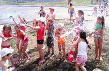 Для детей в лагере в такую жару воспитатели организуют водные процедуры: вода немного нагревается на солнце, в купальных костюмах, шортах дети обливают друг друга из водяных пистолетов, бутылочек. И затем немного загорают на солнце. В эти жаркие дни дети с удовольствием бегут на водные процедуры.