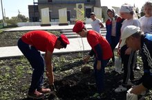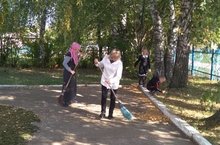 Мәктәп янын чиста, матур тоту өчен җыештыру эшләре бара.