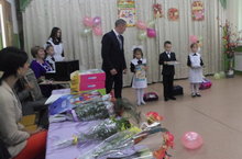 Торжественная линейка "Белем бәйрәме" с участием главы сельского поселения Николаевой Ф.Н. и начальника управления по делам молодежи Федотовой Л.Г. , и родителей.