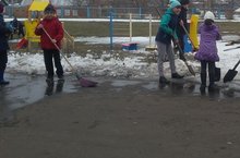 Была проведена уборка, на территории школы: тщательно подметены игровые площадки, стадион, приведены в порядок