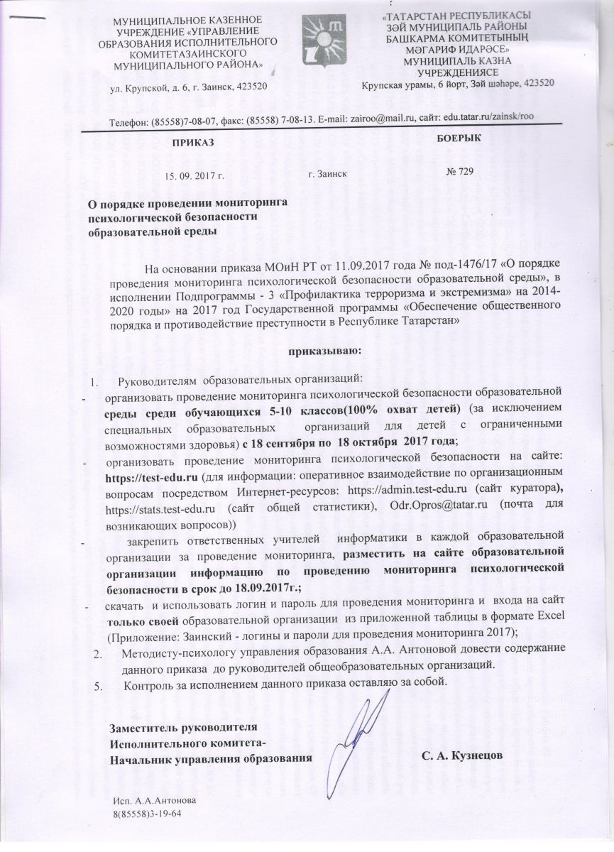 Мониторинг психологической безопасности образовательной среды. Приказ на мониторинг.