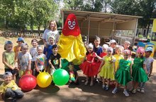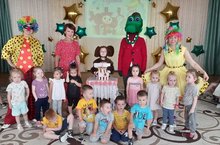 Чебурашку пришли поздравить Клоун Тяпа и Клоунесса Ляля. Дети с Чебурашкой пели (как же без "Каравая"), играли, танцевали и подарили ему свои рисунки.
