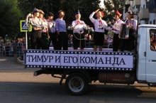 На дне города коллектив нашего детского сада принимал участие в выставке картонных городков и в праздничном шествии. Мы представили вниманию горожан стоп-кадр из фильма "Тимур и его команда"