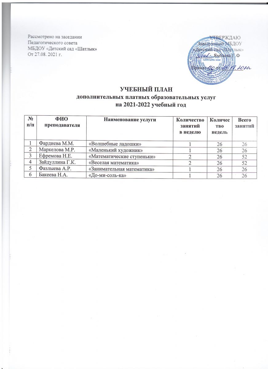 Учебный план по платным образовательным услугам на 2021-2022 учебный год