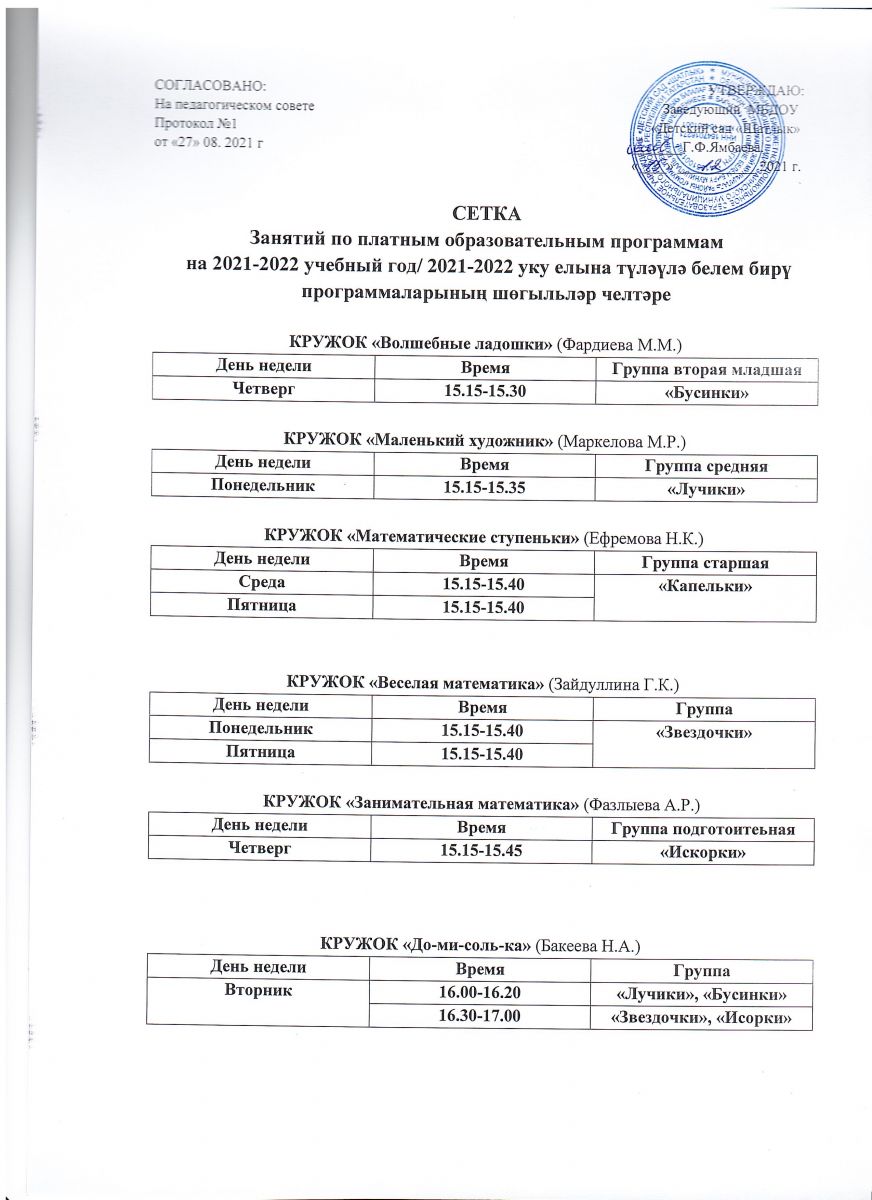 Сетка занятий по платным образовательным программам на 2021-2022 уч. год