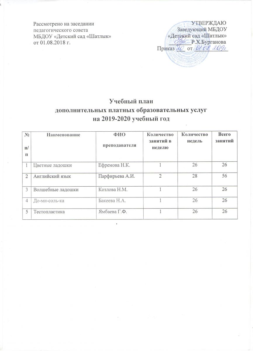 Учебный план по платным образовательным услугам на 2019-2020 учебный год