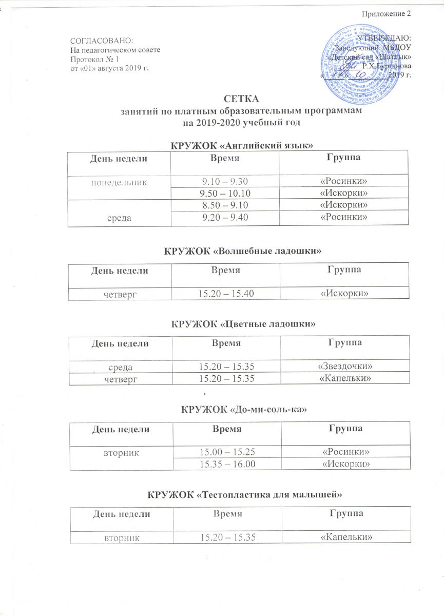 Сетка занятий по платным образовательным программам на 2019-2020 учебный год