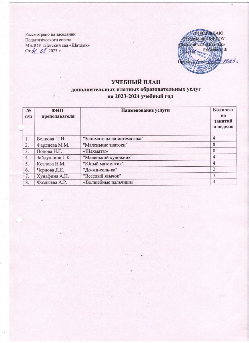 Учебный план по платным образовательным услугам на 2023- 2024 учебный год